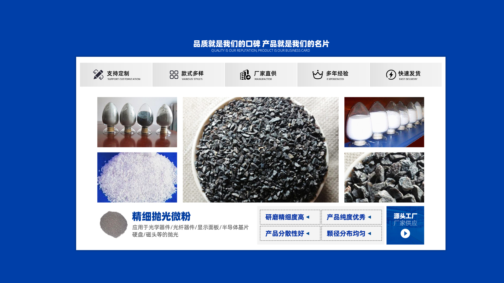 18年來,雙岳磨料經(jīng)過不斷發(fā)展和技術(shù)的積累,凝聚了 一批經(jīng)驗(yàn)豐富,素質(zhì)精良的專業(yè)人才。我們始終堅(jiān)持“客 戶為本”原則發(fā)展,以誠信經(jīng)營為基礎(chǔ),以服務(wù)滿意為保 證,歡迎新老客戶來廠洽談業(yè)務(wù)。
